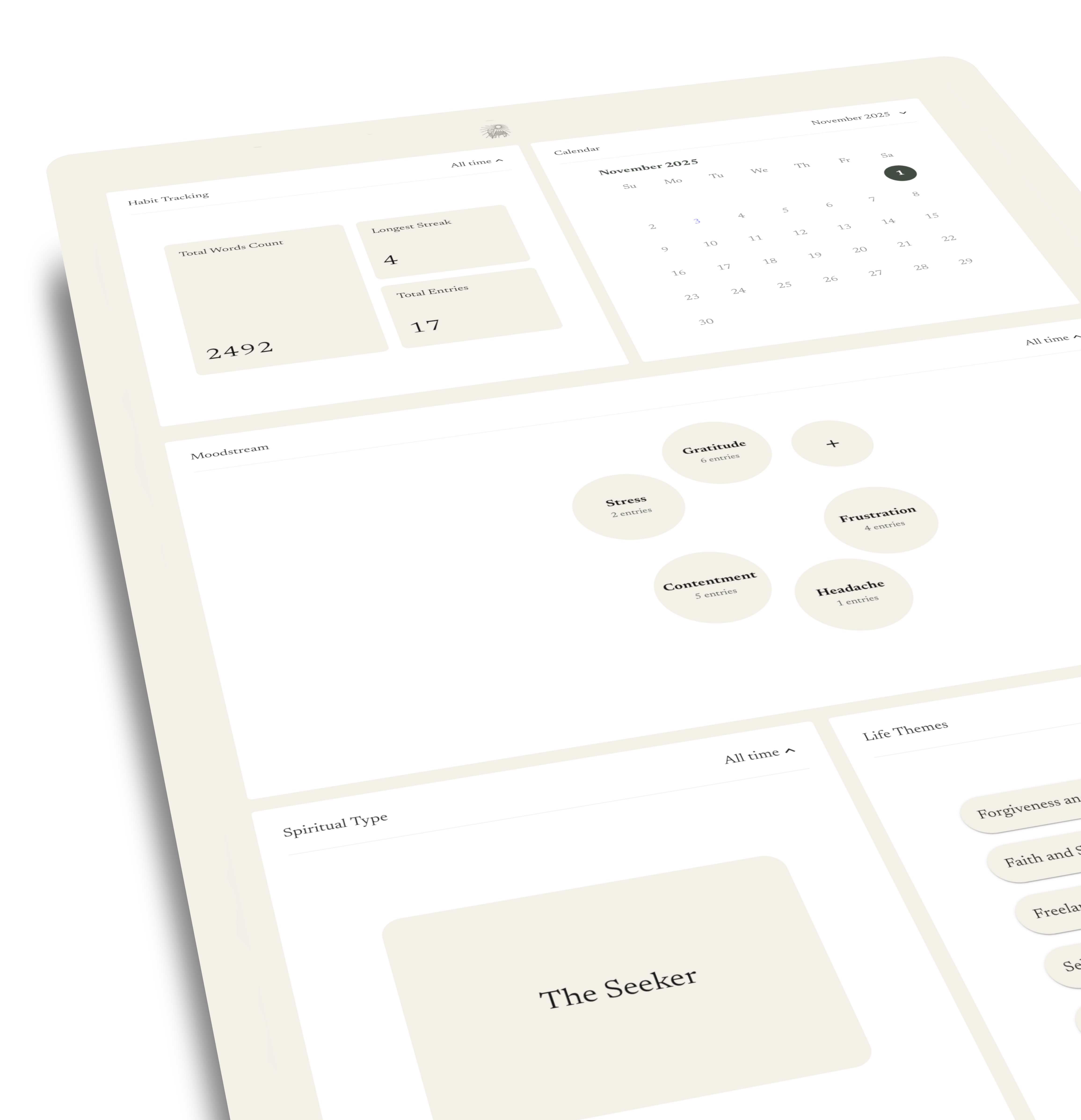 See your journaling at a glance. Track your entries, emotions, and recurring themes—all linked to Scripture for deeper reflection and meaningful insight.